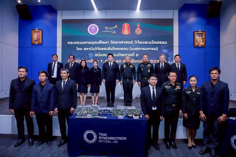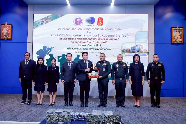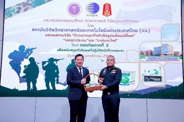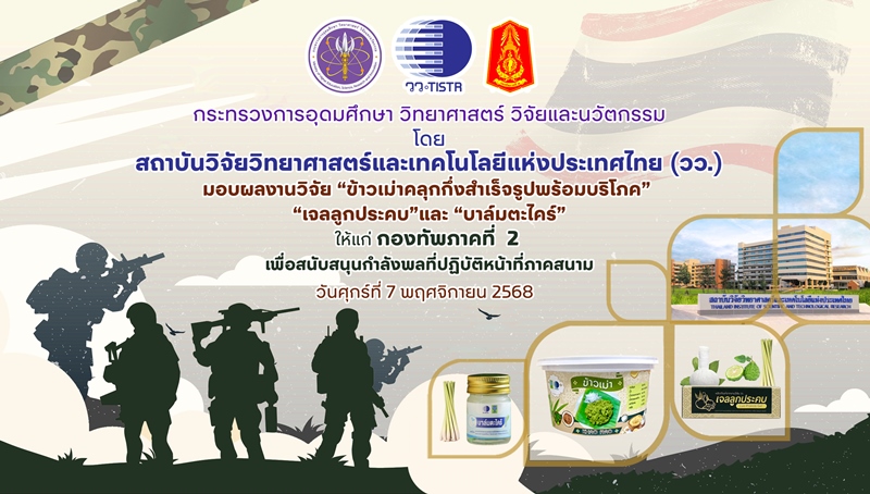 นายสุรศักดิ์ พันธ์เจริญวรกุล รัฐมนตรีว่าการกระทรวงการอุดมศึกษา วิทยาศาสตร์ วิจัยและนวัตกรรม (อว.) เป็นประธานในพิธีส่งมอบอุปกรณ์การแพทย์ภาคสนาม ให้แก่ พลโทวีระยุทธ รักศิลป์ แม่ทัพภาคที่ 2 ประกอบด้วย สายรัดห้ามเลือดแบบก้านหมุน (Tourniquet) จำนวน 1,000 ชุด และเฝือกอ่อน (Splint) จำนวน 500 ชุด พัฒนาโดยสถาบันวิจัยแสงซินโครตรอน (องค์การมหาชน) เพื่อใช้ในราชการสนาม ลดการเสียชีวิตของกำลังพลบริเวณชายแดน นอกจากนี้ยังได้มอบผลิตภัณฑ์ผลงานวิจัยและพัฒนาเพื่อสุขภาพ โดย สถาบันวิจัยวิทยาศาสตร์และเทคโนโลยีแห่งประเทศไทย (วว.) ได้แก่ 1) ผลิตภัณฑ์ข้าวเม่าคลุกกึ่งสำเร็จรูปพร้อมบริโภค จำนวน 200 ชุด ซึ่งเก็บได้นานถึง 6 เดือน เพียงเติมน้ำร้อน 2 นาที หรือใช้น้ำธรรมดา 7 นาที สามารถรับประทานได้ทันที 2) บาล์มตะไคร้ จำนวน 450 ชิ้น มีประสิทธิภาพความปลอดภัยในการรักษาโรคน้ำกัดเท้า และสามารถรักษาโรคผิวหนังที่เกิดจากเชื้อราอื่นๆ ด้วย เช่น กลาก เกลื้อนและ 3) เจลลูกประคบสมุนไพร จำนวน 400 หลอด ที่สกัดจากไพล ขมิ้นชัน มะกรูด และตะไคร้ พัฒนาให้ใช้งานสะดวกในรูปแบบเจล แต่ยังคงคุณสมบัติการบรรเทาอาการปวดเมื่อย เคล็ดขัดยอก และฟกช้ำเช่นเดียวกับลูกประคบสมุนไพรดั้งเดิม
