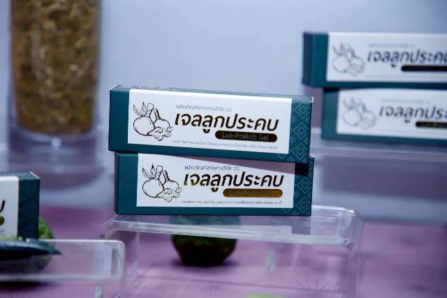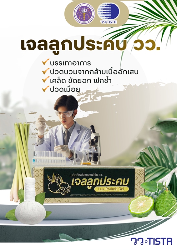 สำหรับผลิตภัณฑ์ “เจลลูกประคบ : Luk Prakob Gel” เป็นผลิตภัณฑ์รูปแบบใหม่จากสมุนไพรไทย โดย วว. ใช้วิธีการสกัดน้ำมันหอมระเหยจากสมุนไพรที่ใช้ในลูกประคบ ได้แก่ ไพล ขมิ้นชัน มะกรูด ตะไคร้ เป็นต้น แล้วนำมาพัฒนาเป็นผลิตภัณฑ์ใหม่ในรูปแบบของเจล เพื่อความสะดวกในการใช้ของผู้บริโภค โดยผลิตภัณฑ์ยังคงประสิทธิภาพในการรักษาอาการปวดเมื่อย ปวดบวมจากกล้ามเนื้ออักเสบ เคล็ดขัดยอก ฟกช้ำ เช่นเดียวกับการประคบด้วยลูกประคบสมุนไพร ผลิตภัณฑ์ผ่านการทดสอบความเป็นพิษ ได้แก่ ความเป็นพิษเฉียบพลันทางผิวหนัง และการก่อความระคายเคืองเบื้องต้น โดยพบว่าผลิตภัณฑ์มีความปลอดภัยต่อการนำไปใช้ นอกจากนี้ผลการศึกษาขั้นคลินิกเพื่อทดสอบประสิทธิภาพของเจลสูตรลูกประคบในการบรรเทาอาการปวดในผู้ป่วยข้อเข่าอักเสบพบว่า ผู้ป่วยมีอาการปวดเข่าน้อยกว่ากลุ่มควบคุมอย่างมีนัยสำคัญทางสถิติและไม่พบผลข้างเคียงใด ๆ