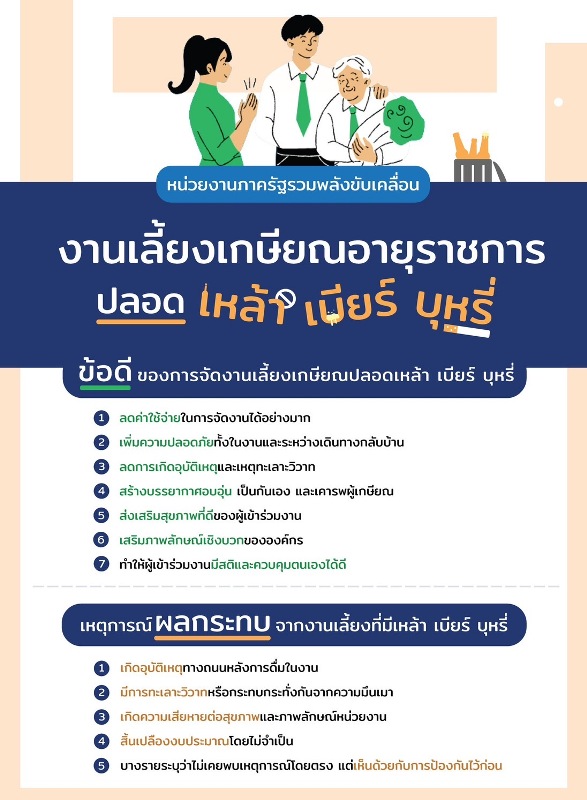 จากข้อมูลของหน่วยงานที่ร่วมรณรงค์ พบ 6 เหตุผลหลัก ได้แก่ (1) ลดความเสี่ยงและสร้างความปลอดภัยในงาน 70% (2) สร้างภาพลักษณ์องค์กรคุณธรรมและต้นแบบที่ดี 55% (3) ส่งเสริมสุขภาวะและลดปัจจัยเสี่ยงต่อสุขภาพ 45% (4) ประหยัดงบประมาณและใช้ทรัพยากรอย่างคุ้มค่า 40% (5) สอดคล้องกับนโยบายภาครัฐและวัฒนธรรมไทย 35% (6) เสริมความสามัคคีและบรรยากาศอบอุ่นในองค์กร (30%)