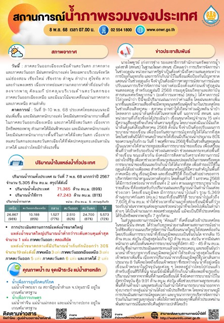 4. ข่าวประชาสัมพันธ์ : นายไพฑูรย์ เก่งการช่าง รองเลขาธิการสำนักงานทรัพยากรน้ำแห่งชาติ (สทนช.) ในฐานะโฆษก สทนช. เปิดเผยว่า การบริหารจัดการน้ำในช่วงฤดูฝน หน่วยงานภาครัฐจำเป็นต้องคำนึงถึงความสมดุลระหว่างการป้องกันอุทกภัย และการกักเก็บน้ำไว้ในเขื่อนเพื่อป้องกันปัญหาขาดแคลนน้ำในช่วงฤดูแล้ง จึงจำเป็นต้องมีการคาดการณ์สถานการณ์และปรับแผนการบริหารจัดการน้ำอย่างต่อเนื่องตั้งแต่ก่อนเข้าสู่ฤดูฝนจนตลอดฤดู สำหรับฤดูฝนปี 2568 กรมอุตุนิยมวิทยาและสถาบันสารสนเทศทรัพยากรน้ำ (องค์การมหาชน) (สสน.) ได้คาดการณ์ไว้ล่วงหน้าว่า ปีนี้จะมีปริมาณฝนมากกว่าค่าเฉลี่ย โดยฝนจะตกเพิ่มมากขึ้นและมีความเสี่ยงที่จะมีพายุหมุนเขตร้อนพัดเข้ามาในประเทศไทยในช่วงเดือนสิงหาคม – ตุลาคม อาจทำให้เกิดน้ำท่วมฉับพลัน น้ำป่า ไหลหลาก และน้ำล้นตลิ่งได้ในหลายพื้นที่ นอกจากนี้ สทนช. และหน่วยงานที่เกี่ยวข้องได้ประเมินว่า เขื่อนขนาดใหญ่จำนวน 15 แห่ง มีความเสี่ยงสูงที่จะเกิดน้ำล้นความจุเขื่อน โดยบางแห่งมีแนวโน้มเกิดน้ำล้นตั้งแต่เดือนสิงหาคม 2568 ดังนั้น จึงจำเป็นต้องปรับแผนการระบายน้ำของเขื่อน เพื่อป้องกันสถานการณ์อุทกภัยให้ได้มากที่สุด โดยในช่วงต้นปีได้กำหนดเป้าหมายให้เขื่อนมีปริมาณน้ำประมาณ 80% ของความจุเก็บกัก ณ วันที่ 1 พฤศจิกายน 2568 ซึ่งเป็นช่วงสิ้นสุดฤดูฝน เป็นแนวทางให้สามารถทยอยเพิ่มการระบายน้ำของเขื่อน เพื่อเตรียมพื้นที่ว่างสำหรับรองรับน้ำช่วงฝนตกหนัก ช่วยลดผลกระทบต่อพื้นที่ท้ายเขื่อน ขณะเดียวกัน ยังคงมีการติดตามวิเคราะห์สถานการณ์อย่างใกล้ชิด เพื่อหาช่วงเวลาที่เหมาะสมและปลอดภัยในการลดหรือหยุดการระบายน้ำของเขื่อนและกักเก็บน้ำให้ได้มากที่สุด เพื่อสำรองไว้ใช้ในฤดูแล้งได้อย่างเพียงพอ สำหรับเขื่อนขนาดใหญ่ที่มีความสำคัญในพื้นที่ภาคเหนือ เช่น เขื่อนภูมิพล และเขื่อนสิริกิติ์ ถือเป็นตัวอย่างของการบริหารจัดการน้ำตามแนวทางดังกล่าว โดยตั้งแต่วันที่ 1 มกราคม 2568 ได้มีการเร่งพร่องน้ำจากเขื่อนทั้ง 2 แห่ง ตามแผนการระบายน้ำเป็นรายเดือน ที่ต้องสอดรับกับปริมาณฝนและปริมาณน้ำในลำน้ำในแต่ละช่วงเวลา โดยเขื่อนภูมิพล มีการระบายน้ำไปแล้ว รวม 5,369 ล้านลูกบาศก์เมตร (ลบ.ม.) ขณะที่เขื่อนสิริกิติ์ ระบายน้ำไปแล้วถึง 7,608 ล้าน ลบ.ม. ทำให้ช่วงเวลาที่ผ่านมาทั้งสองเขื่อนมีพื้นที่ว่างรองรับน้ำฝนจากพายุแต่ละลูกและช่วยหน่วงน้ำที่จะไหลไปเพิ่มในลำน้ำต่างๆ ได้เป็นจำนวนมาก ตลอดช่วงฤดูฝนนี้ แม้จะเป็นปีที่ประเทศไทยได้รับอิทธิพลจากพายุถึง 7 ลูกก็ตาม