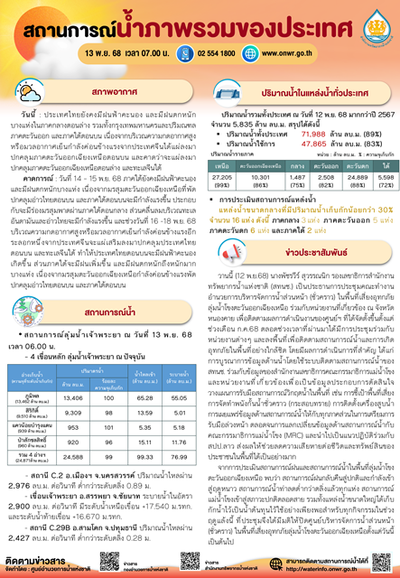 • สถานการณ์ลุ่มน้ำเจ้าพระยา ณ วันที่ 13 พ.ย. 68 เวลา 06.00 น.