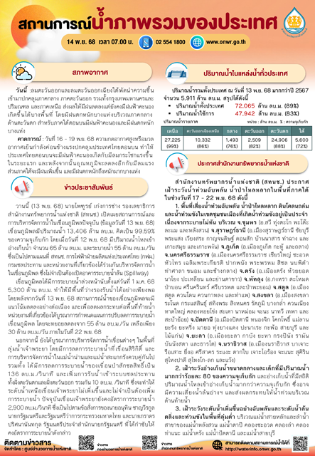 4. ประกาศสำนักงานทรัพยากรน้ำแห่งชาติ : สำนักงานทรัพยากรน้ำแห่งชาติ (สทนช.) ประกาศเฝ้าระวังน้ำท่วมฉับพลัน น้ำป่าไหลหลากในพื้นที่ภาคใต้ ในช่วงวันที่ 17 – 22 พ.ย. 68 ดังนี้