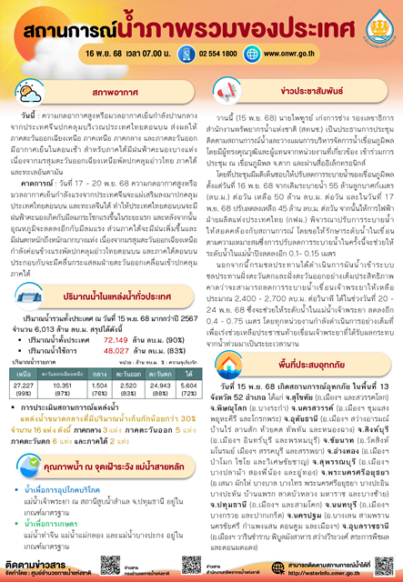 5. พื้นที่ประสบอุทกภัย : วันที่ 15 พ.ย. 68 เกิดสถานการณ์อุทกภัย ในพื้นที่ 13 จังหวัด 52 อำเภอ ได้แก่ จ.สุโขทัย (อ.เมืองฯ และสวรรคโลก) จ.พิษณุโลก (อ.บางระกำ) จ.นครสวรรค์ (อ.เมืองฯ ชุมแสง พยุหะคีรี และโกรกพระ) จ.อุทัยธานี (อ.เมืองฯ สว่างอารมณ์ บ้านไร่ ลานสัก ห้วยคต ทัพทัน และหนองฉาง) จ.สิงห์บุรี (อ.เมืองฯ อินทร์บุรี และพรหมบุรี) จ.ชัยนาท (อ.วัดสิงห์ มโนรมย์ เมืองฯ สรรคบุรี และสรรพยา) จ.อ่างทอง (อ.เมืองฯ ป่าโมก ไชโย และวิเศษชัยชาญ) จ.สุพรรณบุรี (อ.เมืองฯ บางปลาม้า สองพี่น้อง และอู่ทอง) จ.พระนครศรีอยุธยา(อ.เสนา ผักไห่ บางบาล บางไทร พระนครศรีอยุธยา บางปะอิน บางปะหัน บ้านแพรก ลาดบัวหลวง มหาราช และบางซ้าย) จ.ปทุมธานี (อ.เมืองฯ และสามโคก) จ.นนทบุรี (อ.เมืองฯ บางกรวย และปากเกร็ด) จ.นครปฐม (อ.บางเลน สามพราน นครชัยศรี กำแพงแสน ดอนตูม และเมืองฯ) จ.อุบลราชธานี (อ.เมืองฯ วารินชำราบ พิบูลมังสาหาร สว่างวีระวงศ์ ตระการพืชผล และดอนมดแดง)