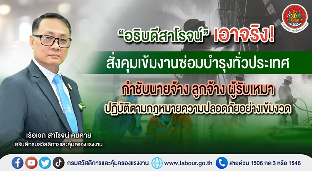 “อธิบดีสาโรจน์” เอาจริง! สั่งคุมเข้มงานซ่อมบำรุงทั่วประเทศ กำชับนายจ้าง ลูกจ้าง ผู้รับเหมาปฏิบัติตามกฎหมายความปลอดภัยอย่างเข้มงวด