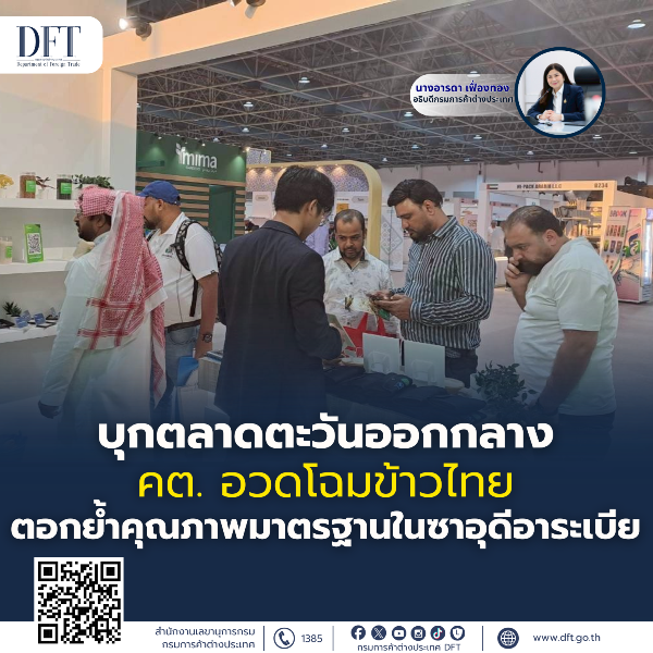 กรมการค้าต่างประเทศจัดกิจกรรมส่งเสริมและประชาสัมพันธ์ภาพลักษณ์ข้าวไทย ในงานแสดงสินค้า FOODEX SAUDI 2025 เพื่อประชาสัมพันธ์ความหลากหลายของข้าวไทยและตอกย้ำภาพลักษณ์ที่ดีและความโดดเด่นของข้าวไทยทั้งในด้านคุณภาพมาตรฐานในซาอุดีอาระเบีย พร้อมทั้งสร้างความรู้และความเข้าใจเกี่ยวกับข้าวคุณลักษณะพิเศษของไทยเพื่อดึงดูดให้ผู้บริโภครู้จักและต้องการบริโภคมากขึ้นด้วย