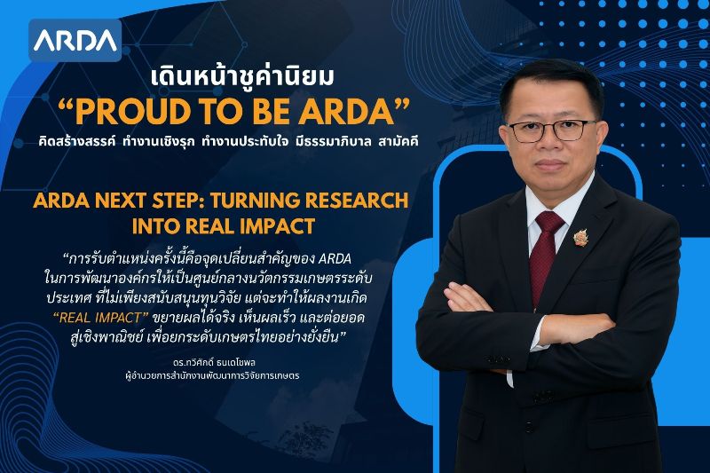 สำนักงานพัฒนาการวิจัยการเกษตร (องค์การมหาชน) หรือ ARDA เปิดทิศทางการทำงานยุคใหม่ภายใต้การนำของ ดร.ทวีศักดิ์ ธนเดโชพล ผู้อำนวยการสำนักงานพัฒนาการวิจัยการเกษตรคนใหม่ พร้อมประกาศจุดยืนองค์กรด้วยค่านิยม PROUD to be ARDA” เพื่อยกระดับ ARDA จากองค์กรสนับสนุนทุนวิจัย สู่ “ศูนย์กลางเชื่อมงานวิจัยสู่พื้นที่จริง” ที่สร้างผลลัพธ์ทางเศรษฐกิจและคุณภาพชีวิตให้เกษตรกรไทยได้อย่างเป็นรูปธรรม
