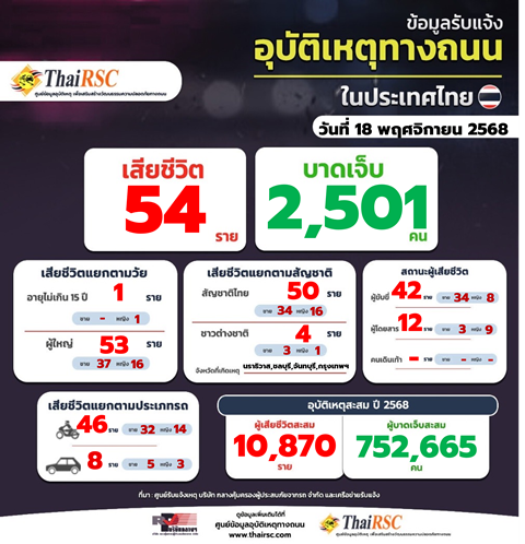 สถานการณ์อุบัติเหตุทางถนนในประเทศไทย วันที่ 18 พ.ย.68 19 พฤศจิกายน 2025Thailandplusประชาสัมพันธ์ Facebook iconFacebookTwitter iconTwitterLINE iconLineสถานการณ์อุบัติเหตุทางถนนในประเทศไทย วันที่ 18 พ.ย.68
