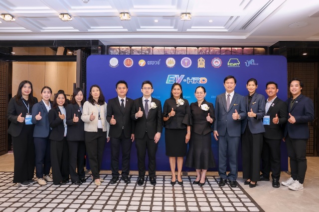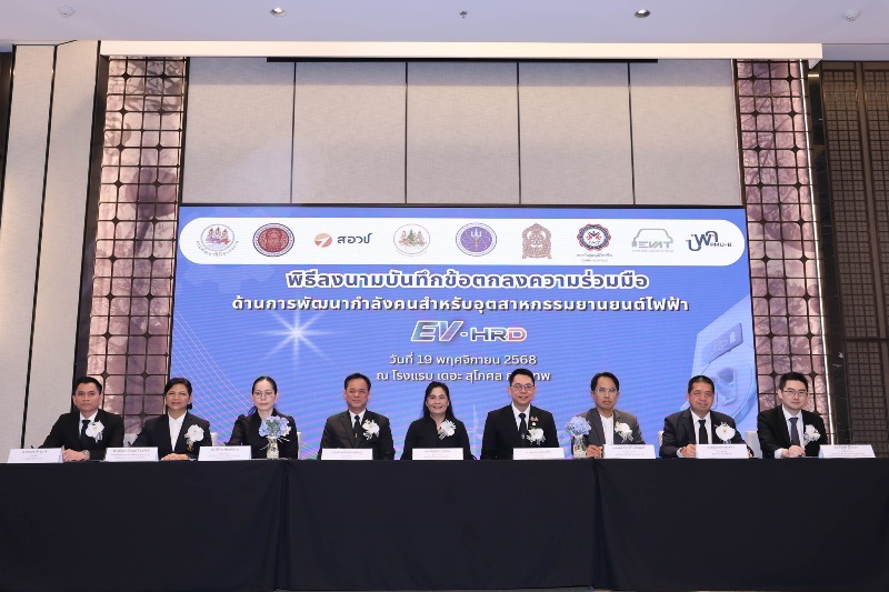 วันที่ 19 พฤศจิกายน 2568 กระทรวงการอุดมศึกษา วิทยาศาสตร์ วิจัยและนวัตกรรม (อว.) โดย สำนักงาน สภานโยบายการอุดมศึกษา วิทยาศาสตร์ วิจัยและนวัตกรรมแห่งชาติ (สอวช.) ร่วมกับหน่วยงานเครือข่าย จัดพิธีลงนามบันทึกข้อตกลงความร่วมมือ (MOU) ด้านการพัฒนากำลังคนสำหรับอุตสาหกรรมยานยนต์ไฟฟ้า (EV – HRD) ระหว่าง สอวช. กับ กรมพัฒนาฝีมือแรงงาน (กพร.) สำนักงานคณะกรรมการการอาชีวศึกษา (สอศ.) สถาบันคุณวุฒิวิชาชีพ (องค์กรมหาชน) (สคช.) สมาคมยานยนต์ไฟฟ้าไทย (EVAT) และหน่วยบริหารและจัดการทุนด้านการพัฒนากำลังคน และทุนด้านการพัฒนาสถาบันอุดมศึกษา การวิจัยและการสร้างนวัตกรรม (บพค.) โดยมี นางเพ็ญนภา กัญชนะ ผู้ตรวจราชการสำนักงานปลัดกระทรวง อว. ดร.สุรพงษ์ เอิมอุทัย ผู้ตรวจราชการกระทรวงศึกษาธิการ (ศธ.) นายสิบหมื่นชัย โพธิสินธุ์ ผู้ตรวจราชการกระทรวงแรงงาน (รง.) กล่าวแสดงความยินดี และเป็นสักขีพยานในความร่วมมือ พร้อมด้วยผู้บริหารทั้ง 6 หน่วยงาน ร่วมลงนามความร่วมมือ ประกอบด้วย ดร.สิริพร พิทยโสภณ รองผู้อำนวยการ สอวช. นายสมชาติ สุภารี รองอธิบดี กพร. นางบัญชาลักษณ์ ลือสวัสดิ์ ที่ปรึกษาด้านมาตรฐานอาชีวศึกษาธุรกิจและบริการ สอศ. นายนิธิวัชร์ ศิริปริยพงศ์ รองผู้อำนวยการ สคช. นายสุโรจน์ แสงสนิท นายก EVAT และ ดร.รัฐภูมิ ตู้จินดา รองผู้อำนวยการ บพค. เป็นผู้ร่วมลงนามในพิธี โดยมีหน่วยงานทั้งภาครัฐ ภาคการศึกษา ภาคเอกชน เข้าร่วมงาน ณ ห้องกมลทิพย์บอลรูม 2 โรงแรม เดอะ สุโกศล กรุงเทพ กว่า 100 คน รวมถึงมีการถ่ายทอดสด Online ผ่าน Facebook LIVE