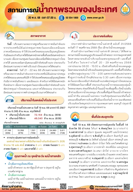 5. พื้นที่ประสบอุทกภัย : วันที่ 19 พ.ย. 68 เกิดสถานการณ์อุทกภัย ในพื้นที่ 14 จังหวัด 55 อำเภอ ได้แก่ จ.พิษณุโลก (อ.บางระกำ) จ.นครสวรรค์ (อ.เมืองฯ ชุมแสง พยุหะคีรี และโกรกพระ) จ.อุทัยธานี (อ.เมืองฯ) จ.สิงห์บุรี (อ.เมืองฯ อินทร์บุรี และพรหมบุรี) จ.ชัยนาท (อ.วัดสิงห์ มโนรมย์ เมืองฯ สรรคบุรี และสรรพยา) จ.อ่างทอง (อ.เมืองฯ ป่าโมก ไชโย และวิเศษชัยชาญ) จ.สุพรรณบุรี (อ.เมืองฯ บางปลาม้า สองพี่น้อง และอู่ทอง) จ.พระนครศรีอยุธยา (อ.เสนา ผักไห่ บางบาล บางไทร พระนครศรีอยุธยา บางปะอิน บางปะหัน บ้านแพรก ลาดบัวหลวง มหาราช และบางซ้าย) จ.ปทุมธานี (อ.เมืองฯ และสามโคก) จ.นนทบุรี (อ.เมืองฯ บางกรวย และปากเกร็ด) จ.นครปฐม (อ.บางเลน สามพราน นครชัยศรี กำแพงแสน ดอนตูม”พุทธมณฑล และเมืองฯ) จ.อุบลราชธานี (อ.เมืองฯ วารินชำราบ พิบูลมังสาหาร สว่างวีระวงศ์ ตระการพืชผล และดอนมดแดง) จ.สุราษฎร์ธานี (อ.ท่าชนะ ไชยา และท่าฉาง) และ จ.สตูล (อ.ละงู)