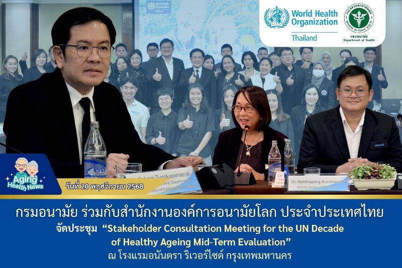 การประชุมหารือผู้มีส่วนได้ส่วนเสีย “Stakeholder Consultation Meeting for the UN Decade of Healthy Ageing Mid-Term Evaluation” จัดขึ้นโดยมีวัตถุประสงค์เพื่อให้ภาคีเครือข่ายผู้มีส่วนได้ส่วนเสียจากทุกภาคส่วนได้ให้ข้อมูลสนับสนุนการรายงานความก้าวหน้า Mid-Term Evaluation of UN Decadeof Healthy Ageing (2021-2030) ของประเทศไทยแก่องค์การอนามัยโลก และเป็นเวทีแลกเปลี่ยนการขับเคลื่อน นโยบายทศวรรษแห่งการสูงวัยอย่างมีสุขภาวะ (Decade of Healthy Ageing: 2021 – 2030) ขององค์การอนามัยโลก (WHO) กลุ่มเป้าหมายประกอบด้วย ผู้แทนจากกระทรวงสาธารณสุข มหาดไทย การพัฒนาสังคมและความมั่นคงของมนุษย์ ดิจิทัลเพื่อเศรษฐกิจและสังคม แรงงาน ศึกษาธิการ และการอุดมศึกษา วิทยาศาสตร์ วิจัยและนวัตกรรม สำนักอนามัย กรุงเทพมหานคร สมาคมสภาผู้สูงอายุแห่งประเทศไทยในพรtราชูปถัมภ์สมเด็จพระศรีนครินทราบรมราชชนนี สำนักงานหลักประกันสุขภาพแห่งชาติ สำนักงานคณะกรรมการสุขภาพแห่งชาติ สำนักงานกองทุนสนับสนุนการสร้างเสริมสุขภาพ กองทุนการออมแห่งชาติ กองทุนประชากรแห่งสหประชาชาติ (UNFPA) ประจำประเทศไทย นโยบายทศวรรษแห่งการสูงวัยอย่างมีสุขภาวะ (Decade of Healthy Ageing: 2021 – 2030) ขององค์การอนามัยโลก (WHO) กำหนด 4 แนวทางหลัก ได้แก่ สภาพแวดล้อมที่เป็นมิตร(Age-Friendly Environments) การลดอคติต่อวัย (Ageism) บริการสุขภาพแบบบูรณาการ (Integrated care for older people) และระบบการดูแลระยะยาวที่ยั่งยืน (Long-Term Care) โดยมีเป้าหมายหลักเพื่อส่งเสริมให้ผู้สูงอายุทุกคนมีสุขภาวะที่ดี สามารถดำรงชีวิตได้อย่างปลอดภัย มีศักดิ์ศรี และมีส่วนร่วมในสังคม ซึ่งสอดคล้องกับทิศทางประเทศไทยที่ต้องแปลงนโยบายสู่การปฏิบัติในระดับพื้นที่ เป็นความร่วมมือระดับโลกที่สอดคล้องกับเป้าหมายการพัฒนาที่ยั่งยืน เพื่อพัฒนาคุณภาพชีวิตของผู้สูงอายุ ครอบครัว และชุมชน การประชุมในครั้งนี้จะนำไปสู่การเสริมสร้างความร่วมมือระหว่างหน่วยงานภาครัฐและผู้มีส่วนได้ส่วนเสียที่ดำเนินงานด้านผู้สูงอายุในประเทศไทย สร้างความสอดคล้องระหว่างโครงการของประเทศไทยกับเป้าหมายระดับโลกเพื่อการสูงวัยอย่างมีสุขภาพดี
