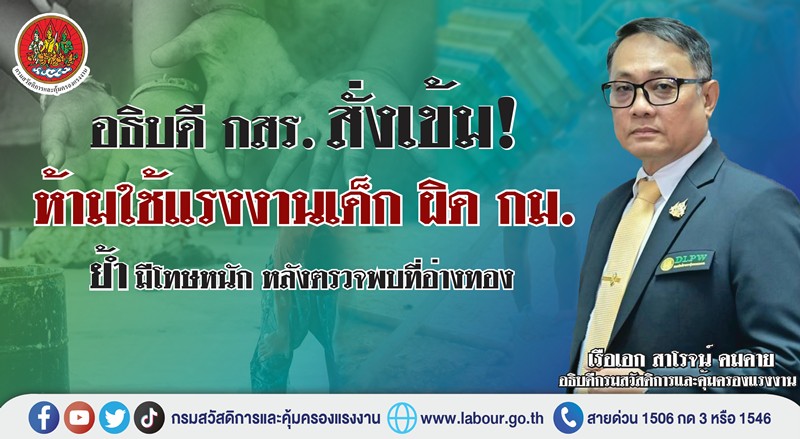 “ผมได้สั่งการให้พนักงานตรวจแรงงานทั่วประเทศเพิ่มความเข้มงวดในการตรวจสอบและเฝ้าระวังการใช้แรงงานเด็กผิดกฎหมายอย่างต่อเนื่อง หากพบการกระทำความผิดต้องดำเนินการตามขั้นตอนของกฎหมายอย่างเด็ดขาด และขอแจ้งเตือนไปยังสถานประกอบกิจการให้ตระหนักถึงความสำคัญของการปฏิบัติตามกฎหมายคุ้มครองแรงงาน โดยเฉพาะอย่างยิ่งกรณีการใช้แรงงานเด็กอายุต่ำกว่า 15 ปี และให้เด็กอายุต่ำกว่า 18 ปีทำงานในสถานที่ที่กฎหมายห้ามหากฝ่าฝืนมีโทษหนักปรับขั้นต่ำ 400,000 – 800,000 บาท ต่อลูกจ้างหนึ่งคน หรือจำคุกไม่เกิน 2 ปี หรือทั้งปรับทั้งจำ” อธิบดี กสร. กล่าว