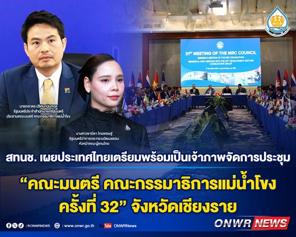 วันที่ 21 พฤศจิกายน 2568 นายดนุชา พิชยนันท์ เลขาธิการสำนักงานทรัพยากรน้ำแห่งชาติ (สทนช.) เปิดเผยว่า รัฐบาลไทย โดยสำนักงานทรัพยากรน้ำแห่งชาติ (สทนช.) ในฐานะสำนักเลขาธิการคณะกรรมการแม่น้ำโขงแห่งชาติไทย ร่วมกับสำนักงานเลขาธิการคณะกรรมาธิการแม่น้ำโขง (MRCS) จะเป็นเจ้าภาพร่วมจัดการประชุมคณะมนตรี คณะกรรมาธิการแม่น้ำโขง ครั้งที่ 32 และการประชุมระหว่างคณะมนตรี คณะกรรมาธิการแม่น้ำโขง และหุ้นส่วนการพัฒนา ครั้งที่ 30 ในระหว่างวันที่ 25 – 27 พฤศจิกายน 2568 ณ โรงแรม เลอ เมอริเดียน รีสอร์ท จังหวัดเชียงราย และเนื่องจากปี 2568 เป็นปีที่การลงนามข้อตกลงความร่วมมือแม่น้ำโขง โดยคณะกรรมาธิการแม่น้ำโขง ครบรอบ 30 ปี ประเทศไทยในฐานะประเทศเจ้าภาพฯ จึงได้กำหนดให้มีการประชุมที่จังหวัดเชียงราย ซึ่งเป็นสถานที่ลงนามข้อตกลงฯ เมื่อปี 2538 เพื่อเน้นย้ำถึงบทบาทในการเป็นผู้นำ