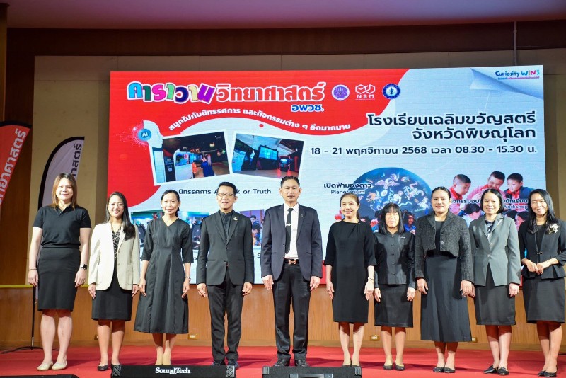 เมื่อวันที่ 18 พฤศจิกายน ที่ผ่านมา นางสาวศิริรัตน์ เสริมวิฑูรย์ รองผู้อำนวยการองค์การพิพิธภัณฑ์วิทยาศาสตร์แห่งชาติ (อพวช.) หรือ NSM กระทรวงการอุดมศึกษา วิทยาศาสตร์ วิจัยและนวัตกรรม พร้อมด้วย ว่าที่ร้อยตรีสมจิตร รอดเรือง รองผู้อำนวยการสำนักงานเขตพื้นที่การศึกษามัธยมศึกษาพิษณุโลก อุตรดิตถ์ และดร.ปิยะชัย ภู่จันทร์ดิฐกุล ผู้อำนวยการโรงเรียนเฉลิมขวัญสตรี ร่วมเปิดงาน “คาราวานวิทยาศาสตร์ อพวช. จ.พิษณุโลก” ภายในงานประกอบด้วยนิทรรศการและกิจกรรมความรู้มากมาย อาทิ นิทรรศการวิทยาศาสตร์เคลื่อนที่, นิทรรศการ AI Trick or Truth, กิจกรรม Explorium, กิจกรรมมุมนักประดิษฐ์ และกิจกรรมเกมและของเล่นวิทยาศาสตร์ จัดเต็มความสนุกตลอด 4 วัน ตั้งแต่วันที่ 18-21 พฤศจิกายน 2568 ณ โรงเรียนเฉลิมขวัญสตรี จ.พิษณุโลก