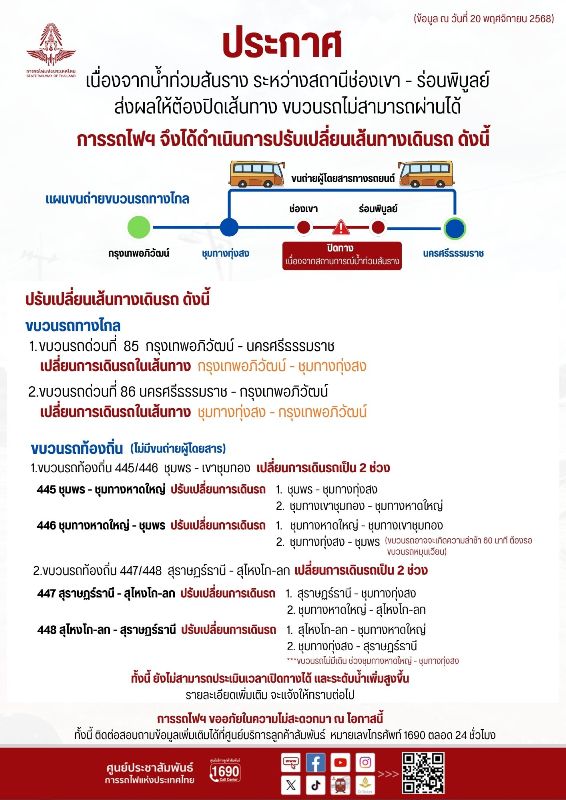 วันที่ 20 พฤศจิกายน 2568 การรถไฟแห่งประเทศไทย ประกาศปิดเส้นทางรถไฟระหว่างสถานีช่องเขา – ร่อนพิบูลย์ จังหวัดนครศรีธรรมราช บริเวณหลักกิโลเมตร 775/15 – 776/3 หลังตรวจพบระดับน้ำท่วมสูงเหนือสันรางประมาณ 15 เซนติเมตร และมีแนวโน้มเพิ่มสูงขึ้นอย่างต่อเนื่อง ส่งผลให้สภาพทางไม่ปลอดภัยต่อการเดินรถจึงจำเป็นต้องสั่งปิดทางเป็นการชั่วคราว พร้อมปรับเปลี่ยนสถานีต้นทาง-ปลายทาง จำนวน 6 ขบวน ดังนี้