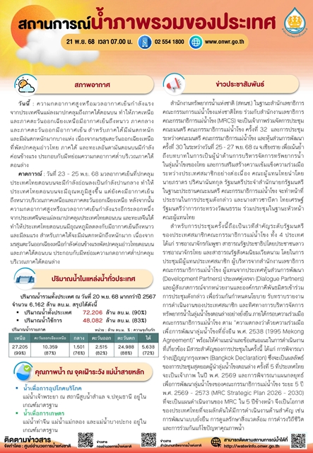 4. ข่าวประชาสัมพันธ์ : สำนักงานทรัพยากรน้ำแห่งชาติ (สทนช.) ในฐานะสำนักเลขาธิการคณะกรรมการแม่น้ำโขงแห่งชาติไทย ร่วมกับสำนักงานเลขาธิการคณะกรรมาธิการแม่น้ำโขง (MRCS) จะเป็นเจ้าภาพร่วมจัดการประชุมคณะมนตรี คณะกรรมาธิการแม่น้ำโขง ครั้งที่ 32 และการประชุมระหว่างคณะมนตรี คณะกรรมาธิการแม่น้ำโขง และหุ้นส่วนการพัฒนา ครั้งที่ 30 ในระหว่างวันที่ 25 – 27 พ.ย. 68 ณ จ.เชียงราย เพื่อเน้นย้ำถึงบทบาทในการเป็นผู้นำด้านการบริหารจัดการทรัพยากรน้ำในลุ่มน้ำโขงของไทย และการเสริมสร้างความเข้มแข็งความร่วมมือระหว่างประเทศสมาชิกอย่างต่อเนื่อง คณะผู้แทนไทยนำโดย นายภราดร ปริศนานันทกุล รัฐมนตรีประจำสำนักนายกรัฐมนตรี ในฐานะประธานคณะมนตรี คณะกรรมาธิการแม่น้ำโขง จะทำหน้าที่ประธานในการประชุมดังกล่าว และนางสาวซาบีดา ไทยเศรษฐ์ รัฐมนตรีว่าการกระทรวงวัฒนธรรม ร่วมประชุมในฐานะหัวหน้าคณะผู้แทนไทย