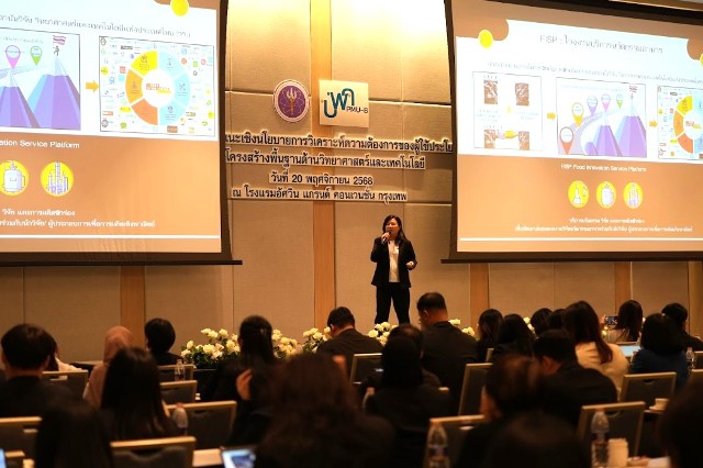 ดร.กุลรภัส วชิรศิริ นักวิจัยอาวุโส ศูนย์เชี่ยวชาญนวัตกรรมอาหารสุขภาพ และผู้จัดการโรงงานบริการนวัตกรรมอาหาร (FISP) สถาบันวิจัยวิทยาศาสตร์และเทคโนโลยีแห่งประเทศไทย (วว.) กระทรวงการอุดมศึกษา วิทยาศาสตร์ วิจัยและนวัตกรรม (อว.) เป็นผู้แทน วว. ร่วมเป็นวิทยากรบรรยายหัวข้อ “การให้บริการและกลยุทธ์การส่งเสริมของหน่วยงานโรงงานบริการนวัตกรรมอาหาร” เนื่องในการประชุมเชิงวิพากษ์ข้อเสนอแนะเชิงนโยบายด้านการวิเคราะห์ความต้องการของผู้ใช้ประโยชน์จากโครงสร้างพื้นฐานด้านวิทยาศาสตร์และเทคโนโลยี (บพค.) เมื่อวันที่ 20 พฤศจิกายน 2568 ณ โรงแรมอัศวิน แกรนด์ คอนเวนชัน เขตหลักสี่ กรุงเทพฯ