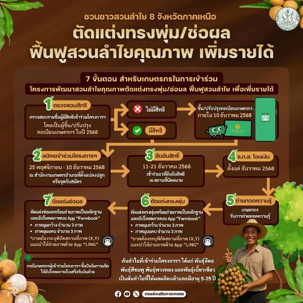 เกษตรฯ เปิดหลักเกณฑ์และขั้นตอนการเข้าร่วมโครงการพัฒนาสวนลำไยคุณภาพตัดแต่งทรงพุ่ม/ช่อผลฟื้นฟูสวนลำไย เพื่อเพิ่มรายได้ ภายหลังจากที่คณะรัฐมนตรีมีมติเห็นชอบโครงการฯ ดำเนินการในพื้นที่ 8 จังหวัด ภาคเหนือ เน้นย้ำเป็นเกษตรกรที่ขึ้นและปรับปรุงทะเบียนเกษตรกรกับกรมส่งเสริมการเกษตรแล้ว และเป็นพื้นที่ที่ปลูกลำไยที่ให้ผลผลิตแล้ว และต้นลำไยมีอายุตั้งแต่ 5 – 25 ปี โดยจะได้รับการสนับสนุนค่าดำเนินการ ค่าปัจจัยการผลิต ในการตัดแต่งทรงพุ่มและช่อผล ในอัตราไร่ละ 1,000 บาท ไม่เกิน 10 ไร่ ต่อครัวเรือน