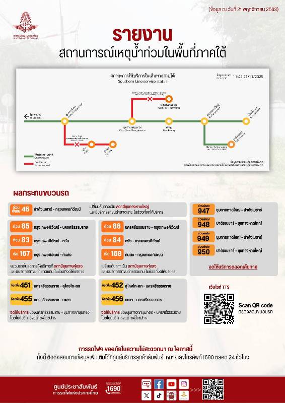 นายอนันต์ โพธิ์นิ่มแดง รองผู้ว่าการรถไฟแห่งประเทศไทย รักษาการในตำแหน่งผู้ว่าการรถไฟแห่งประเทศไทย เปิดเผยว่า วันนี้ (21 พฤศจิกายน 68) ได้เกิดเหตุน้ำท่วมระดับสูงกว่าสันราง ประมาณ 15 เซนติเมตร บริเวณหลักกิโลเมตรที่ 933/15-934/3 ระหว่างสถานีชุมทางหาดใหญ่ – คลองแงะ จังหวัดสงขลา ระยะทางประมาณ 200 เมตร ระดับน้ำมีแนวโน้มสูงขึ้นอย่างต่อเนื่อง ทำให้ทางรถไฟเสียหายหลายจุด การรถไฟฯ จึงมีความจำเป็นต้องประกาศงดเดินรถในเส้นทางสายใต้ ช่วงสถานีชุมทางหาดใหญ่ – คลองแงะ จังหวัดสงขลา เป็นการชั่วคราว เพื่อดูแลความปลอดภัยในการเดินทาง
