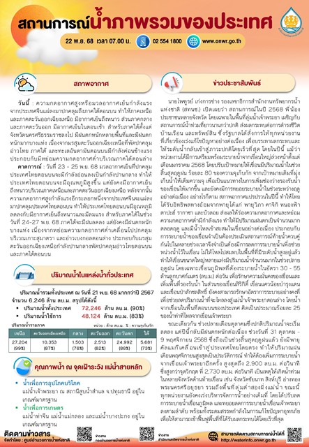 4. ข่าวประชาสัมพันธ์ : นายไพฑูรย์ เก่งการช่าง รองเลขาธิการสำนักงานทรัพยากรน้ำแห่งชาติ (สทนช.) เปิดเผยว่า สถานการณ์ในปี 2568 พี่น้องประชาชนหลายจังหวัด โดยเฉพาะในพื้นที่ลุ่มน้ำเจ้าพระยา เผชิญกับสถานการณ์น้ำท่วมที่ยาวนานกว่าปกติ ส่งผลกระทบต่อการดำรงชีวิต บ้านเรือน และทรัพย์สิน ซึ่งรัฐบาลได้สั่งการให้ทุกหน่วยงานที่เกี่ยวข้องเร่งแก้ไขปัญหาอย่างต่อเนื่อง เพื่อบรรเทาผลกระทบและให้ระดับน้ำกลับเข้าสู่ภาวะปกติโดยเร็วที่สุด โดยในปีนี้ แม้ว่าหน่วยงานได้มีการเตรียมพร้อมระบายน้ำจากเขื่อนใหญ่ล่วงหน้าตั้งแต่เดือนมกราคม 2568 โดยปรับเป้าหมายให้เขื่อนมีปริมาณน้ำในช่วงสิ้นสุดฤดูฝน ร้อยละ 80 ของความจุเก็บกัก จากเป้าหมายเดิมที่มุ่งเก็บน้ำให้เต็มความจุ เพื่อเป็นแนวทางในการเพิ่มช่องว่างรองรับน้ำของเขื่อนให้มากขึ้น และยังคงมีการทยอยระบายน้ำในช่วงระหว่างฤดูอย่างต่อเนื่อง อย่างไรก็ตาม สภาพอากาศแปรปรวนในปีนี้ ทำให้ไทยได้รับอิทธิพลทางอ้อมจากพายุได้แก่ พายุวิภา คาจิกิ หนองฟ้า ตาปะฮ์ รากาซา และบัวลอย ส่งผลให้ร่องความกดอากาศและหย่อมความกดอากาศต่ำมีกำลังแรง ทำให้มีปริมาณฝนตกเป็นจำนวนมากตลอดฤดู และมีน้ำไหลเข้าสะสมในเขื่อนอย่างต่อเนื่อง ประกอบกับการระบายน้ำของเขื่อนจำเป็นต้องประเมินสถานการณ์ท้ายน้ำควบคู่กันไปในหลายช่วงเวลาจึงจำเป็นต้องมีการลดการระบายน้ำเพื่อช่วยหน่วงน้ำไว้ในเขื่อน ไม่ให้ไหลไปสมทบในพื้นที่ที่มีระดับน้ำสูงอยู่แล้ว ทำให้เขื่อนขนาดใหญ่หลายแห่งมีปริมาณน้ำจำนวนมากในช่วงปลายฤดูฝน โดยเฉพาะเขื่อนภูมิพลที่ต้องระบายน้ำในอัตรา 30 – 55 ล้านลูกบาศก์เมตร (ลบ.ม.) ต่อวัน เพื่อรักษาความมั่นคงของเขื่อนและเพิ่มพื้นที่รองรับน้ำ ในส่วนของเขื่อนสิริกิติ์ เขื่อนแควน้อยบำรุงแดน และเขื่อนป่าสักชลสิทธิ์ ยังคงสามารถรักษาอัตราการระบายอย่างคงที่ เพื่อช่วยลดปริมาณน้ำที่จะไหลลงสู่แม่น้ำเจ้าพระยาตอนล่าง โดยน้ำจากเขื่อนในพื้นที่ตอนบนของประเทศ คิดเป็นประมาณร้อยละ 25 ของน้ำท่าที่ไหลจากเขื่อนเจ้าพระยา ขณะเดียวกัน ช่วงปลายเดือนตุลาคมซึ่งปกติปริมาณน้ำจะเริ่มลดลง แต่ปีนี้กลับมีฝนตกหนักต่อเนื่อง ช่วงวันที่ 31 ตุลาคม – 9 พฤศจิกายน 2568 ซึ่งถือเป็นช่วงสิ้นสุดฤดูฝนแล้ว ยังมีพายุคัลแมกีเคลื่อนเข้าสู่ประเทศไทยโดยตรง ทำให้ปริมาณฝนเดือนพฤศจิกายนสูงสุดเป็นประวัติการณ์ ทำให้ต้องเพิ่มการระบายน้ำจากเขื่อนเจ้าพระยาอีกครั้ง สูงสุดถึง 2,900 ลบ.ม. ต่อวินาที ซึ่งสูงกว่าจุดวิกฤต ที่ 2,730 ลบ.ม. ต่อวินาที เป็นเหตุให้เกิดน้ำท่ว