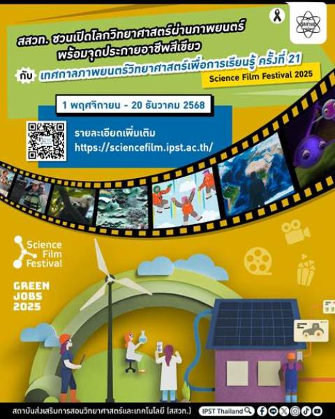 แสง สี เสียง และเรื่องราวแห่งแรงบันดาลใจได้กลับมาอีกครั้ง! กับ “เทศกาลภาพยนตร์วิทยาศาสตร์เพื่อการเรียนรู้ ครั้งที่ 21 (Science Film Festival 2025)” พร้อมพาผู้ชมทุกวัยออกเดินทางสู่โลกของ “วิทยาศาสตร์ที่มีชีวิต” ผ่านภาพยนตร์จากทั่วโลกกว่า 28 เรื่อง จาก 14 ประเทศ ที่จะทำให้ทุกคนเห็นว่า วิทยาศาสตร์ไม่ได้อยู่แค่ในห้องเรียน แต่แทรกอยู่ในทุกมุมของชีวิตจริง เทศกาลในปีนี้มาในแนวคิดสุดทันสมัย “Green Jobs – งานสีเขียว” เพื่อจุดประกายเยาวชนให้ตระหนักถึงอาชีพแห่งอนาคตที่เติบโตคู่กับการดูแลรักษ์โลก และชวนทุกคนค้นหาอาชีพแห่งอนาคตที่ยั่งยืน และเป็นมิตรต่อสิ่งแวดล้อม พร้อมทั้งกิจกรรมฉายภาพยนตร์ทั่วประเทศ ในระหว่างวันที่ 1 พฤศจิกายน – 20 ธันวาคม 2568 จัดโดยสถาบันส่งเสริมการสอนวิทยาศาสตร์และเทคโนโลยี (สสวท.) ร่วมกับสถาบันเกอเธ่ ประเทศไทย และองค์การพิพิธภัณฑ์วิทยาศาสตร์แห่งชาติ (อพวช.) พร้อมหน่วยงานหลักที่ร่วมจัดและพันธมิตรระดับโลก เพื่อให้ผู้ชมทุกวัยได้เรียนรู้วิทยาศาสตร์ในมุมมองใหม่ที่สนุกและเข้าถึงง่าย