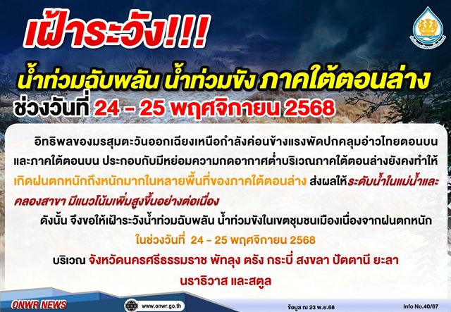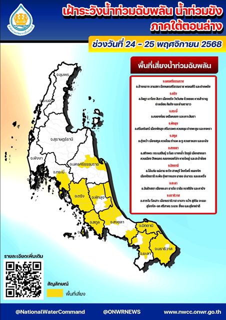 สำนักงานทรัพยากรน้ำแห่งชาติ เฝ้าระวัง!!!น้ำท่วมฉับพลัน น้ำท่วมขัง ภาคใต้ตอนล่างช่วงวันที่ 24 – 25 พฤศจิกายน 2568