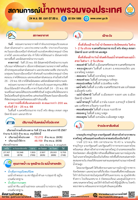 2. สถานการณ์น้ำอ่างเก็บน้ำในภาพรวม : ปริมาณน้ำรวม 90% ของความจุเก็บกัก (72,272 ล้าน ลบ.ม.) ปริมาณน้ำใช้การ 83% (48,159 ล้าน ลบ.ม.)