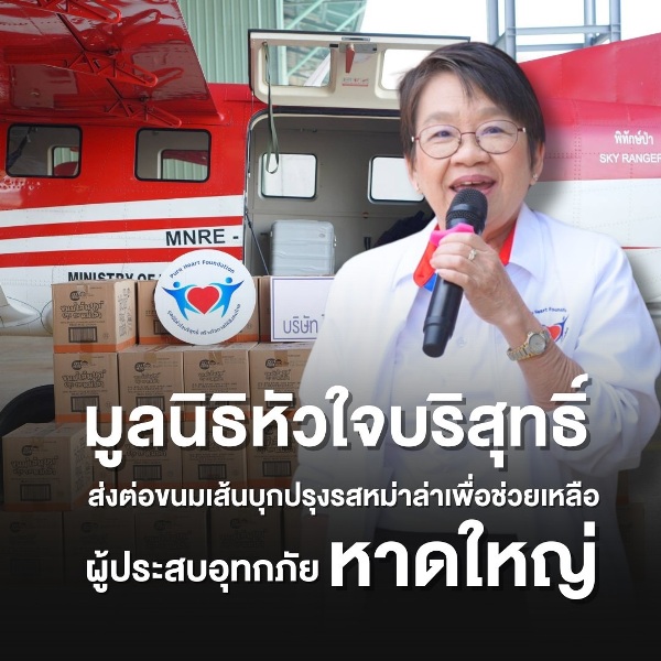 วันที่ 26 พฤศจิกายน 2568 นางเธียรรัตน์ นะวะมะวัฒน์ ประธานมูลนิธิหัวใจบริสุทธิ์ พร้อมทีมงาน ส่งมอบขนมเส้นบุกปรุงรสหม่าล่า จำนวน 72,000 ชิ้น มูลค่ารวม 720,000 บาท ซึ่งได้รับการสนับสนุนจากคุณสราญจิตร หวัง กรรมการ บริษัท ไบ่ ลี่ เอ็นเตอร์ไพร์ส จำกัด ให้กับศูนย์เทคโนโลยีดิจิทัลและอากาศยาน สำนักงานปลัดกระทรวงทรัพยากรธรรมชาติและสิ่งแวดล้อม เป็นผู้ขนส่งลำเลียงผ่านเฮลิคอปเตอร์ไปช่วยเหลือชาวบ้านในพื้นที่อำเภอหาดใหญ่ จังหวัดสงขลา ที่ได้รับผลกระทบจากวิกฤตน้ำท่วม ณ ฝูงเครื่องบิน กองการบิน ศูนย์การเคลื่อนย้ายกองทัพบก (ขส.ทบ.)