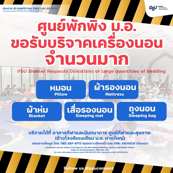 • บริจาคสิ่งของได้ที่: อาคารกีฬาและนันทนาการ ศูนย์กีฬาและสุขภาพ (ข้างโรงยิมเนเซียม ม.อ. หาดใหญ่)