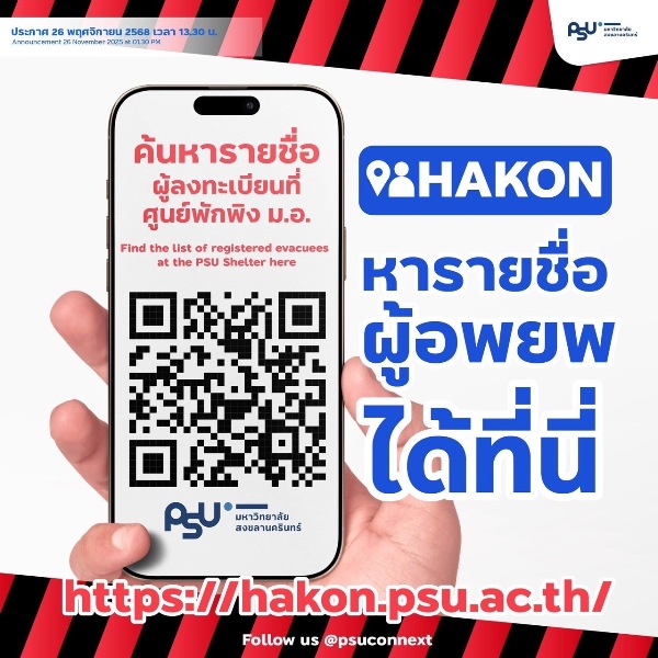 • ค้นหารายชื่อ ผู้ลงทะเบียนที่ศูนย์พักพิง ม.อ. ผ่านทาง: https://hakon.psu.ac.th/