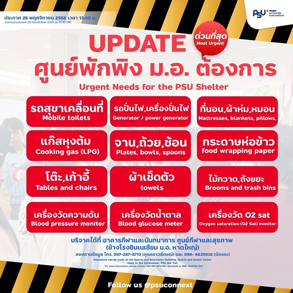 มหาวิทยาลัยสงขลานครินทร์ย้ำว่าพร้อมปฏิบัติหน้าที่เคียงข้างประชาชนในสถานการณ์ครั้งนี้อย่างเต็มกำลัง โดยจะประเมินสถานการณ์น้ำและความต้องการของผู้ประสบภัยอย่างต่อเนื่อง เพื่อให้การช่วยเหลือดำเนินไปอย่างเป็นระบบและตอบสนองความจำเป็นเร่งด่วนของชุมชนในพื้นที่อำเภอหาดใหญ่ได้อย่างมีประสิทธิภาพที่สุด