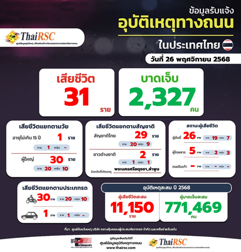 สถานการณ์อุบัติเหตุทางถนนในประเทศไทย วันที่ 26 พ.ย.68