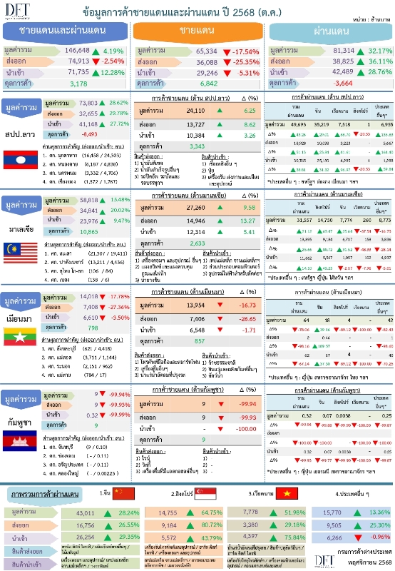 การค้าชายแดนกับประเทศเพื่อนบ้าน 4 ประเทศ เดือนตุลาคม 2568 มีมูลค่าการค้ารวม 65,334 ล้านบาท (-17.5%) เป็นการส่งออก 36,088 ล้านบาท (-25.4%) การนำเข้า 29,246 ล้านบาท (-5.3%) และไทยได้ดุลการค้ารวมทั้งสิ้น 6,842 ล้านบาท โดยการค้าชายแดนกับมาเลเซียมีมูลค่าสูงสุด 27,260 ล้านบาท (+9.6%) รองลงมา คือ สปป.ลาว 24,110 ล้านบาท (+6.3%) เมียนมา 13,954 ล้านบาท (-16.7%) และกัมพูชา 9 ล้านบาท (-99.9%) ซึ่งสินค้าส่งออกชายแดนสำคัญในเดือนตุลาคม 2568 ได้แก่ น้ำมันดีเซล 2,539 ล้านบาท เครื่องคอมพิวเตอร์และอุปกรณ์ อื่นๆ 1,306 ล้านบาท และน้ำมันสำเร็จรูปอื่นๆ 1,113 ล้านบาท ทำให้ 10 เดือนแรกของปี 2568 การค้าชายแดนมีมูลค่ารวม 766,465 ล้านบาท (-6.2%) เป็นการส่งออก 449,580 ล้านบาท (-10.1%) และการนำเข้า 316,885 ล้านบาท (+0.1%)