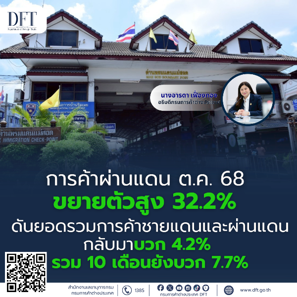อธิบดีกรมการค้าต่างประเทศกล่าวว่า การค้าชายแดนและผ่านแดนในเดือนตุลาคม 2568 กลับมาขยายตัวอีกครั้งในรอบ 3 เดือน จากการค้าผ่านแดนที่ขยายตัวสูง 32.2% โดยการส่งออกผ่านแดนไปยัง 3 ตลาดสำคัญ ได้แก่ จีน สิงคโปร์ และเวียดนาม ขยายตัวสูง 26.6% 80.7% และ 29.2% ตามลำดับ โดยสินค้าส่งออกผ่านแดนในกลุ่มอิเล็กทรอนิกส์ยังคงขยายตัวได้ดี อาทิ ฮาร์ด ดิสก์ ไดรฟ์ 10,350 ล้านบาท (+71.4%) เครื่องคอมพิวเตอร์และอุปกรณ์ อื่นๆ 2,052 ล้านบาท (+76.7%) เครื่องรับโทรศัพท์และอุปกรณ์ 2,010 ล้านบาท (+4,280.0%) และส่วนประกอบคอมพิวเตอร์ 1,315 ล้านบาท (+303.8%) และแผงวงจรไฟฟ้า 1,126 ล้านบาท (+50.7%) เนื่องจากความต้องการสินค้าอิเล็กทรอนิกส์ในตลาดโลกที่เพิ่มขึ้น และแนวโน้มการลงทุนในอุตสาหกรรมอิเล็กทรอนิกส์และกลุ่ม Data center ที่ยังขยายตัวต่อเนื่องในไทย ในขณะที่กลุ่มสินค้ายางพาราและผลิตภัณฑ์ก็ขยายตัวได้ดีเช่นกัน อาทิ ผลิตภัณฑ์ยางอื่นๆ (เช่น ยางสังเคราะห์) 2,925 ล้านบาท (+32.5%) ยางแผ่นรมควัน ชั้นที่ 3 1,445 ล้านบาท (+22.4%) และถุงมือยาง 1,052 ล้านบาท (+13.6%)