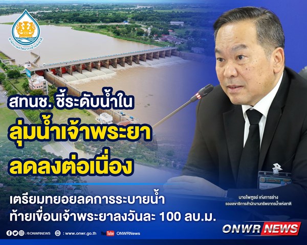 สทนช. ชี้ระดับน้ำในลุ่มน้ำเจ้าพระยาลดลงต่อเนื่อง เตรียมทยอยลดการระบายน้ำท้ายเขื่อนเจ้าพระยาลงวันละ 100 ลบ.ม.