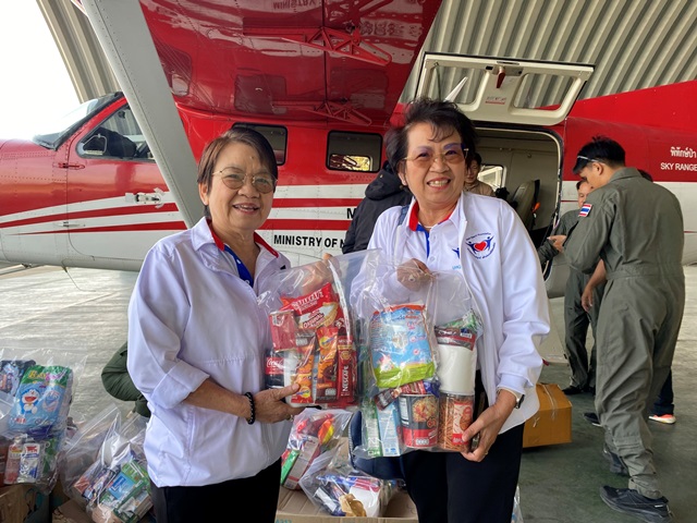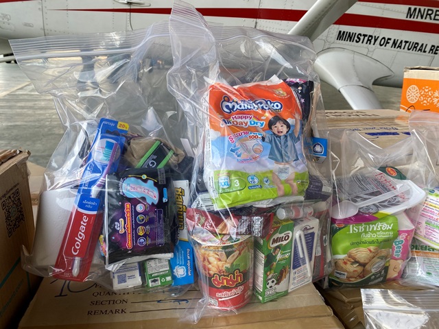 การส่งมอบถุงยังชีพในครั้งนี้ประกอบด้วย ถุงยังชีพอาหารแห้งจำนวน 200 ชุด ถุงยังชีพอาหารพร้อมทาน 300 ชุด และน้ำดื่ม 10 แพ็ก เพื่อช่วยบรรเทาความเดือดร้อนและสนับสนุนการดำรงชีวิตประจำวันของชาวบ้านที่ได้รับผลกระทบ โดยสิ่งของทั้งหมดได้ถูกลำเลียงด้วยเครื่องบินเล็ก โดยมี นางอริสรา สิทธิยศผู้อำนวยการศูนย์เทคโนโลยีดิจิทัลและอากาศยาน จากศูนย์เทคโนโลยีดิจิทัลและอากาศยาน สำนักงานปลัดกระทรวงทรัพยากรธรรมชาติและสิ่งแวดล้อม เป็นผู้แทนรับมอบ ก่อนนำไปกระจายต่ออย่างทั่วถึง ณ ฝูงเครื่องบิน กองการบิน ศูนย์การเคลื่อนย้ายกองทัพบก (ขส.ทบ.)