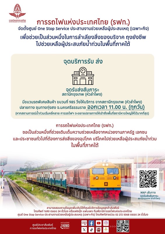 การรถไฟแห่งประเทศไทย (รฟท.) เคลื่อนขบวนจัดตั้ง “ศูนย์รวมน้ำใจ เพื่อบรรเทาภัยน้ำท่วมภาคใต้” เพื่อเป็นศูนย์กลางรับบริจาคสิ่งของอุปโภคบริโภคและของใช้จำเป็นสำหรับช่วยเหลือประชาชนที่ได้รับผลกระทบจากสถานการณ์อุทกภัยในพื้นที่ภาคใต้อย่างเร่งด่วน โดยเปิดรับบริจาคตั้งแต่วันนี้เป็นต้นไป ในวันและเวลาราชการ เวลา 08.30 – 16.30 น. ณ สถานีกรุงเทพ (หัวลำโพง) บริเวณจุดรับ-ส่ง สัมภาระ โดยลำเลียงสิ่งของไปกับขบวนรถสินค้าห่อวัตถุด่วนที่ 985 โดยออกจากสถานีกรุงเทพ (หัวลำโพง) – ชุมทางทุ่งสง เวลา 11.00 น. ของทุกวัน