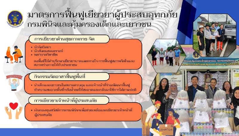 – การฟื้นฟูเยียวยาผู้ประสบอุทกภัยด้านสุขภาพกายและสุขภาพจิต โดยมีทีมจิตแพทย์ นักจิตวิทยา นักสังคมสงเคราะห์ และพยาบาลวิชาชีพ จากกรมพินิจและคุ้มครองเด็กและเยาวชน และสถาบันนิติวิทยาศาสตร์ ลงพื้นที่ให้คำปรึกษาเยียวยาบาดแผลทางใจ ฟื้นฟูด้านสุขภาพจิตและสภาพร่างกายให้กับประชาชนในพื้นที่ประสบภัยพิบัติ