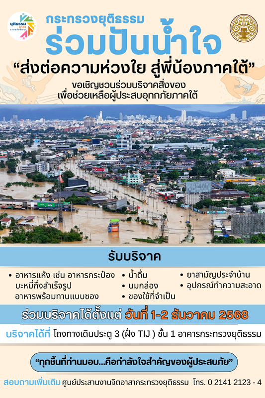 กระทรวงยุติธรรม เร่งช่วยเหลือเยียวยาผู้ประสบอุทกภัยจากสถานการณ์น้ำท่วมในพื้นที่ภาคใต้