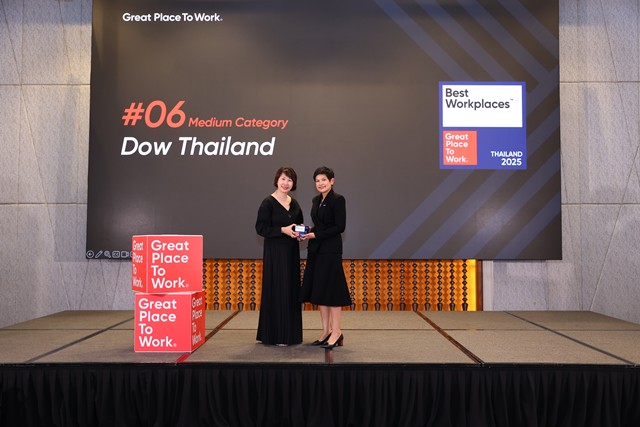 กรุงเทพฯ – 28 พฤศจิกายน 2568 – กลุ่มบริษัท ดาว ประเทศไทย (Dow) ได้รับการรับรองสถานที่ทำงานยอดเยี่ยมของประเทศไทย Best WorkplaceTM in Thailand ประจำปี 2568 (ประเภทองค์กรขนาดกลาง) เป็นครั้งแรกหลังจากที่ได้รับการรับรองสถานที่ทำงานยอดเยี่ยมจาก Great Place to Work® มาตั้งแต่ปี 2565 สะท้อนให้เห็นถึงค่านิยมและหลักการที่ Dow ยึดมั่นในการพัฒนาสภาพแวดล้อมการทำงานที่อบอุ่น ให้คุณค่าและความสำคัญต่อพนักงานทุกคนอย่างเท่าเทียม มุ่งมั่นที่จะมอบประสบการณ์ที่ดีตลอดชีวิตการทำงาน และสนับสนุนให้เกิดวัฒนธรรมการยอมรับความแตกต่างหลากหลายในองค์กร โดยมีนางสาวสุวธิดา ศรียะพันธุ์ ผู้จัดการฝ่ายพัฒนาวัฒนธรรมองค์กรและส่งเสริมประสบการณ์พนักงาน กลุ่มบริษัท ดาว ประเทศไทย รับมอบรางวัลจาก นางเอเวลิน เควก กรรมการผู้จัดการ Great Place To Work ประจำภูมิภาคอาเซียนและออสเตรเลีย-นิวซีแลนด์ ณ โรงแรมมิลเลนเนียม ฮิลตัน แบงค็อก กรุงเทพมหานคร