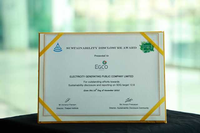 บริษัท ผลิตไฟฟ้า จำกัด (มหาชน) หรือ EGCO Group รับรางวัลเกียรติคุณการเปิดเผยข้อมูลความยั่งยืน ประจำปี 2568 (Sustainability Disclosure Award 2025) ต่อเนื่องเป็นปีที่ 7 จากสถาบันไทยพัฒน์ ซึ่งเป็นรางวัลสูงสุดของเวทีนี้ ตอกย้ำการเปิดเผยข้อมูลความยั่งยืน ESG (Environmental, Social and Governance) ที่ครอบคลุมทุกด้านอย่างครบถ้วน ตั้งแต่ด้านเศรษฐกิจ สังคม และสิ่งแวดล้อม ตอบโจทย์เป้าหมายการพัฒนาที่ยั่งยืน (SDGs) ข้อที่ 12.6 ขององค์การสหประชาชาติ โดย นางสาวสลิล ติระวัฒน์ ผู้ช่วยกรรมการผู้จัดการใหญ่สายบริหารองค์กร EGCO Group เป็นผู้แทนบริษัทฯ เข้ารับรางวัลจาก นายวรณัฐ เพียรธรรม ผู้อำนวยการสถาบันไทยพัฒน์ ในพิธีมอบรางวัลการเปิดเผยข้อมูลความยั่งยืน ประจำปี 2568 ซึ่งจัดขึ้น ณ หอศิลปวัฒนธรรมแห่งกรุงเทพมหานคร เมื่อเร็ว ๆ นี้