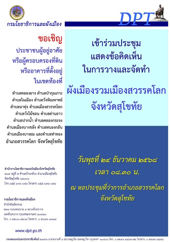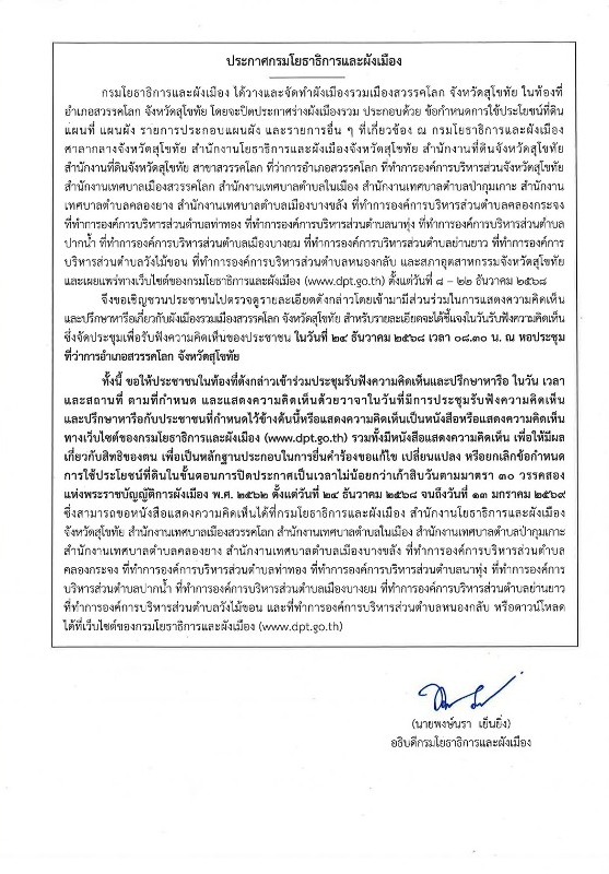 กรมโยธาธิการและผังเมือง ได้วางและจัดทำผังเมืองรวมเมืองสวรรคโลก จังหวัดสุโขทัย ในท้องที่อำเภอสวรรคโลก จังหวัดสุโขทัย จึงขอเชิญชวนประชาชนไปตรวจดูรายละเอียดดังกล่าวโดยเข้ามามีส่วนร่วมในการแสดงความคิดเห็นและปรึกษาหารือเกี่ยวกับผังเมืองรวมเมืองสวรรคโลก จังหวัดสุโขทัย สำหรับรายละเอียดจะได้ชี้แจงในวันรับฟังความคิดเห็น ซึ่งจัดประชุมเพื่อรับฟังความคิดเห็นของประชาชน ในวันที่ 24 ธันวาคม 2568 เวลา 08.30 น. ณ หอประชุมที่ว่าการอำเภอสวรรคโลก จังหวัดสุโขทัย