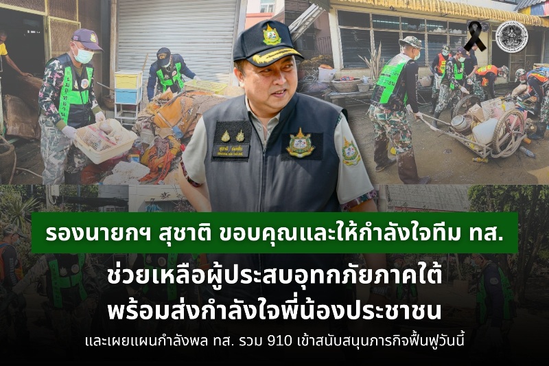 ทั้งนี้รองนายกฯสุชาติ ยังได้ส่งกำลังใจและความห่วงใยไปยังพี่น้องประชาชนทุกคนที่กำลังประสบความเดือดร้อนจากภัยน้ำท่วมในภาคใต้ โดยขอให้ทุกท่านเข้มแข็ง ผ่านพ้นช่วงเวลานี้ไปด้วยกัน และให้ความมั่นใจกับพี่น้องประชาชนว่า เจ้าหน้าที่ ทส. ทุกหน่วยงานจะอยู่ให้การสนับสนุนภารกิจการช่วยเหลือและฟื้นฟูในพื้นที่ จนกว่าสถานการณ์จะคลี่คลายและภารกิจทุกอย่างจะแล้วเสร็จ เพื่อให้พี่น้องประชาชนสามารถกลับมาใช้ชีวิตได้ตามปกติโดยเร็วที่สุด”