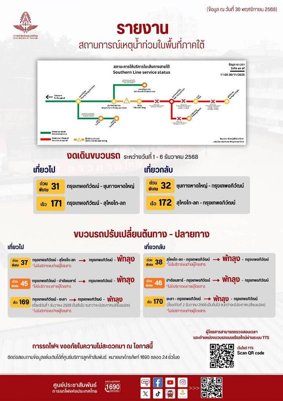 การรถไฟฯ จำเป็นต้องปิดทาง เพื่อดำเนินการซ่อมแซม และฟื้นฟูสภาพทางรถไฟที่ได้รับความเสียหาย เพื่อให้สามารถกลับมาใช้งานได้ตามปกติโดยเร็ว พร้อมแจ้งปรับเปลี่ยนขบวนรถ จำนวน 6 ขบวน และงดเดินขบวนรถอีก 4 ขบวน เพื่อให้สามารถเปิดให้บริการได้อย่างปลอดภัยสูงสุด ตั้งแต่วันนี้ – 6 ธันวาคม 2568 ดังนี้.-
