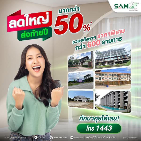 สอบถามรายละเอียดเพิ่มเติมได้ที่ Call Center 1443 และดูรายละเอียดทรัพย์สินได้ทางเว็บไซต์ที่ www.sam.or.th รวมทั้งช่องทางออนไลน์ที่หลากหลายและสะดวกรวดเร็ว โดยแอด ID Line @Samline ติดตาม Facebook /YouTube / TikTok ได้ที่ “SAM บริหารสินทรัพย์สุขุมวิท” เพื่อติดตามข้อมูลข่าวสารดี ๆ จาก SAM