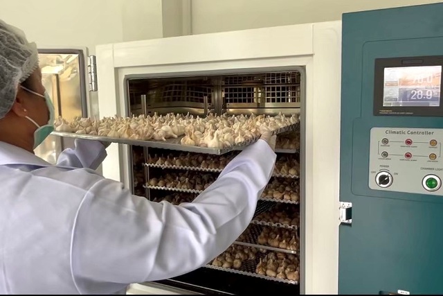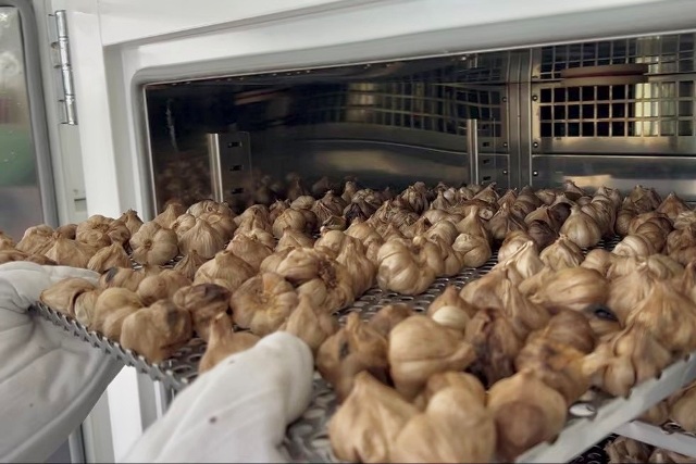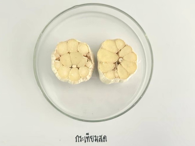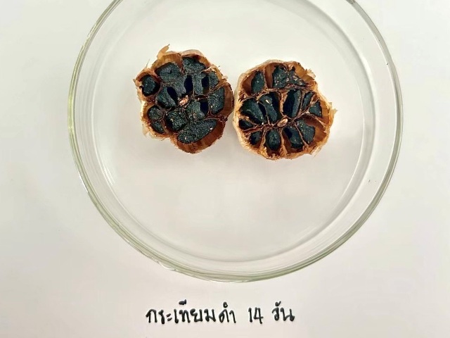 ผู้ช่วยศาสตราจารย์ ดร.จิรนันต์ รัตสีวอ หัวหน้าโครงการวิจัยฯ กล่าวเพิ่มเติมว่า ตลอดระยะเวลา 1 ปี คณะวิจัยได้จัดทำแปลงสาธิตต้นแบบจำนวน 13 แปลง และถ่ายทอดองค์ความรู้ให้เกษตรกรกว่า 50 ราย ครอบคลุมตั้งแต่กระบวนการผลิตกระเทียมตามมาตรฐาน GAP และ GI ไปจนถึงการแปรรูปเป็น “กระเทียมดำ” ด้วยเครื่องบ่มอุณหภูมิ 60–90 °C และความชื้นสัมพัทธ์ร้อยละ 80-85 ภายใต้หลักการเกิด ปฏิกิริยาเมลลาร์ด (Maillard Reaction) ที่ทำให้กลีบกระเทียมเปลี่ยนเป็นสีดำ รสหวานนุ่ม ไม่มีกลิ่นฉุน และเก็บได้นานกว่า 12 เดือน พร้อมยังอุดมไปด้วยสารสำคัญทางชีวภาพ เช่น S-allylcysteine (SAC) สารฟีนอลิกและสารฟลาโวนอยด์ ซึ่งเป็นสารต้านอนุมูลอิสระประสิทธิภาพสูง โดยงานวิจัยพบว่า “กระเทียมดำศรีสะเกษ” มีปริมาณ SAC 0.485 มก./กรัม (แบบโทน) และ 0.399 มก./กรัม (แบบกลีบ) อยู่ในเกณฑ์มาตรฐานของ สำนักงานคณะกรรมการอาหารและยา (อย.) ซึ่งเป็นดัชนีสำคัญของอาหารสุขภาพระดับพรีเมียม