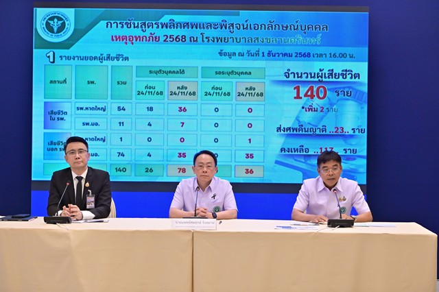 วันที่ 1 ธันวาคม 2568 ที่ศูนย์ปฏิบัติการแก้ไขสถานการณ์ฉุกเฉินอุทกภัย (ศป.กฉ.) ทำเนียบรัฐบาล นพ.สมฤกษ์ จึงสมาน ปลัดกระทรวงสาธารณสุข พร้อมด้วย นพ.ศักดา อัลภาชน์ รองปลัดกระทรวงสาธารณสุข และนพ.เอกชัย เพียรศรีวัชรา รองปลัดกระทรวงสาธารณสุข ร่วมแถลงข่าวในประเด็นการดำเนินงานด้านการแพทย์และสาธารณสุขในสถานการณ์อุทกภัยพื้นที่ภาคใต้ ว่า จำนวนผู้เสียชีวิตจากสถานการณ์น้ำท่วม หาดใหญ่ ณ วันที่ 1 ธันวาคม 2568 เวลา 16.00 น. มีทั้งสิ้น 140 ราย ส่วนอีก 7 จังหวัดที่เหลือได้แก่ นครศรีธรรมราช พัทลุง ตรัง สตูล ยะลา ปัตตานี และ นราธิวาส ให้ติดตามตรวจสอบและรายงานเข้ามาในระบบต่อไป