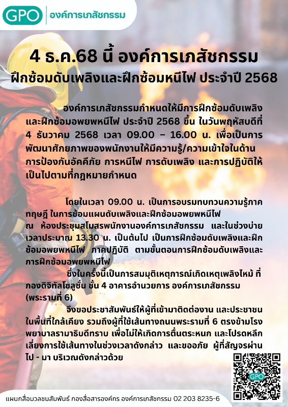 องค์การเภสัชกรรมกำหนดให้มีการฝึกซ้อมดับเพลิงและฝึกซ้อมอพยพหนีไฟ ประจำปี 2568 ขึ้น ในวันพฤหัสบดีที่ 4 ธันวาคม 2568 เวลา 09.00 – 16.00 น. เพื่อเป็นการพัฒนาศักยภาพของพนักงานให้มีความรู้ ความเข้าใจในด้านการป้องกันอัคคีภัย การหนีไฟ การดับเพลิง และการปฏิบัติให้เป็นไปตามที่กฎหมายกำหนด