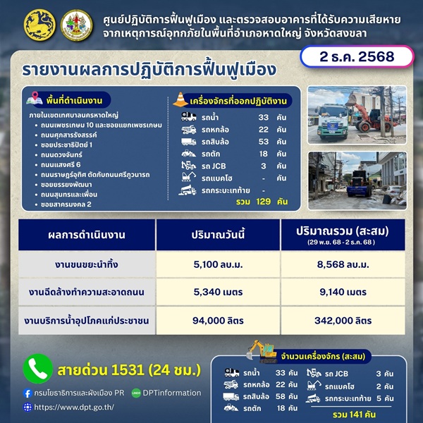 วันที่ 2 ธันวาคม 2568 กรมโยธาธิการและผังเมือง โดย ศูนย์ปฏิบัติการฟื้นฟูเมือง และตรวจสอบอาคารที่ได้รับความเสียหายจากเหตุการณ์อุทกภัย ในพื้นที่อำเภอหาดใหญ่ จังหวัดสงขลา (ส่วนหน้า) รับข้อสั่งการจาก นายอรรษิษฐ์ สัมพันธรัตน์ ปลัดกระทรวงมหาดไทย เสริมทีมปฏิบัติการฟื้นฟูพื้นที่ โซนที่ 3 ตั้งแต่ถนนทางหลวงชนบท 2029 ถึงคลองอู่ตะเภา เพิ่มเติมจากพื้นที่ที่รับผิดชอบเดิม คือ โซน 1 และ โซน 4 เพื่อเร่งฟื้นฟูพื้นที่ประสบอุทกภัยในเขตอำเภอหาดใหญ่ จังหวัดสงขลา และยกระดับความปลอดภัยของประชาชนอย่างเร่งด่วน