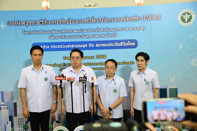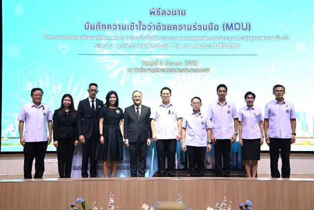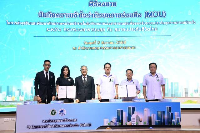 วันที่ 3 ธันวาคม 2568 ที่ห้องประชุมใหญ่ ชั้น 10 สำนักงานคณะกรรมการอาหารและยา นายพัฒนา พร้อมพัฒน์ รัฐมนตรีว่าการกระทรวงสาธารณสุข เป็นประธานพิธีลงนามบันทึกความเข้าใจว่าด้วยความร่วมมือ (MOU) ในการส่งเสริมและพัฒนาศักยภาพหน่วยบริการในสังกัดกระทรวงสาธารณสุข เพื่อรองรับระบบประกันสุขภาพภาคสมัครใจ ระหว่างกระทรวงสาธารณสุข กับสมาคมประกันชีวิตไทย โดยมี นพ.สมฤกษ์ จึงสมาน ปลัดกระทรวงสาธารณสุข นางนุสรา (อัสสกุล) บัญญัติปิยพจน์ นายกสมาคมประกันชีวิตไทย และนายสาระ ล่ำซำ อุปนายกฝ่ายการตลาด สมาคมประกันชีวิตไทย เป็นผู้ลงนาม และมี นายชูฉัตร ประมูลผล เลขาธิการคณะกรรมการกำกับและส่งเสริมการประกอบธุรกิจประกันภัย (คปภ.) และผู้อำนวยการโรงพยาบาลนำร่อง 28 แห่งจากทั่วประเทศร่วมเป็นสักขีพยาน