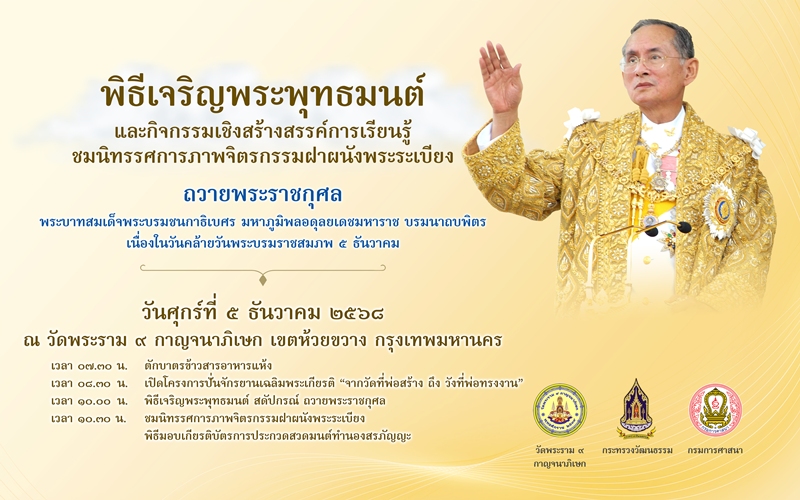 ปลัดกระทรวงวัฒนธรรม กล่าวอีกว่า ในส่วนของกรมการศาสนา ได้จัดพิธีเจริญพระพุทธมนต์และกิจกรรมเชิงสร้างสรรค์การเรียนรู้ชมนิทรรศการภาพจิตรกรรมฝาผนังพระระเบียง ถวายพระราชกุศล ที่ถ่ายทอดเรื่องราวพระราชประวัติ พระราชพิธี และพระราชกรณียกิจของพระบาทสมเด็จพระบรมชนกาธิเบศร มหาภูมิพลอดุลยเดชมหาราช บรมนาถบพิตร ณ วัดพระราม 9 กาญจนาภิเษก เขตห้วยขวางกรุงเทพมหานคร โดยได้รับเกียรติจากผู้ทรงคุณวุฒิจากกรมศิลปากร เป็นผู้บรรยายให้ความรู้ ตั้งแต่เวลา 10.00 น. เป็นต้นไป